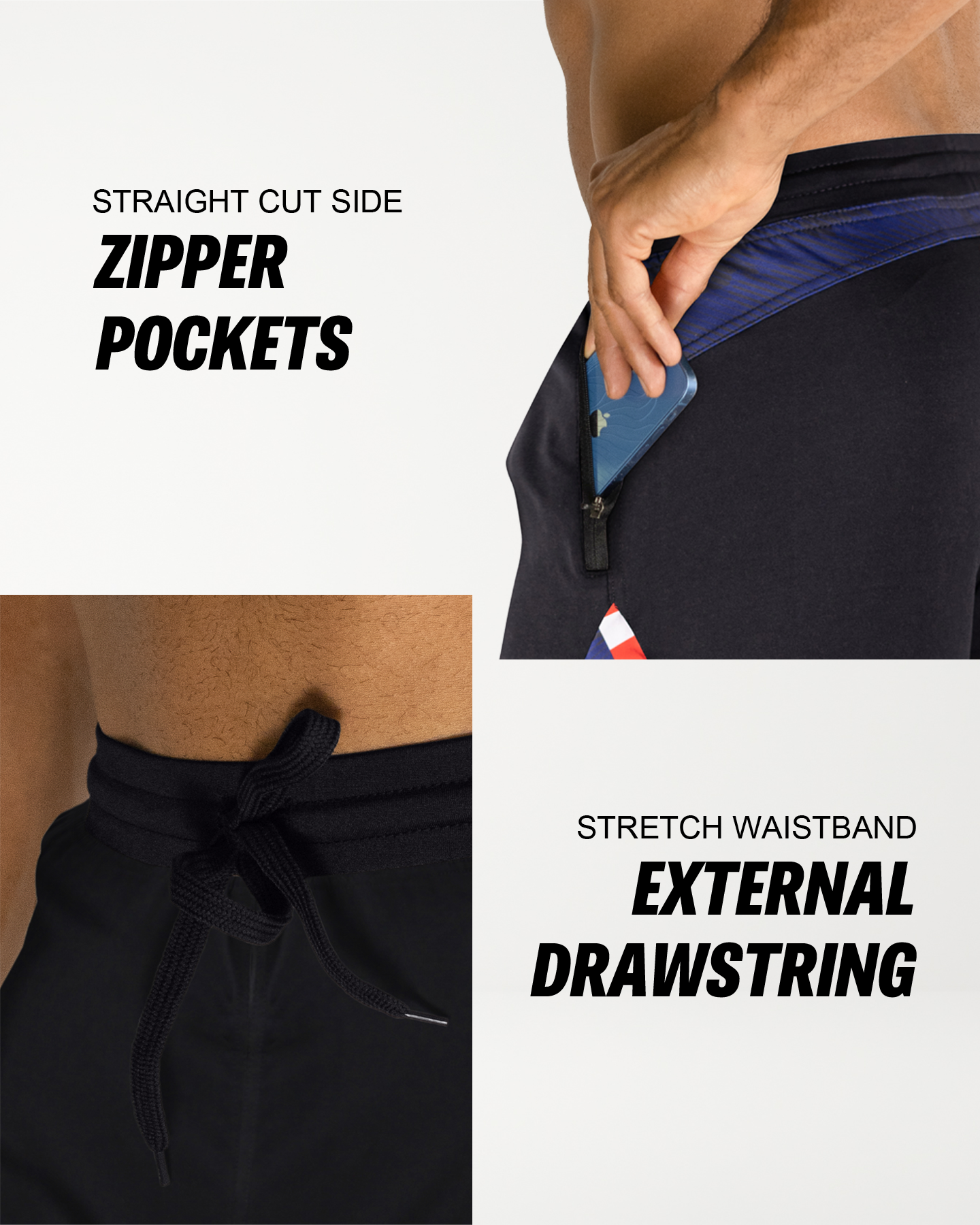 KEY FEATURES. Zippered front pockets designed for cross-training and functional workouts. Handcrafted from a strong/soft/stretch-performance fabric and high-impact flatlock stitching. Optimized for cross-training, fitness, functional training, yoga and gym workouts. Typically falls 4-5" above the knee (5" Inseam). Modern, athletic fit. American sizing. Designed in the USA. Buy with confidence.